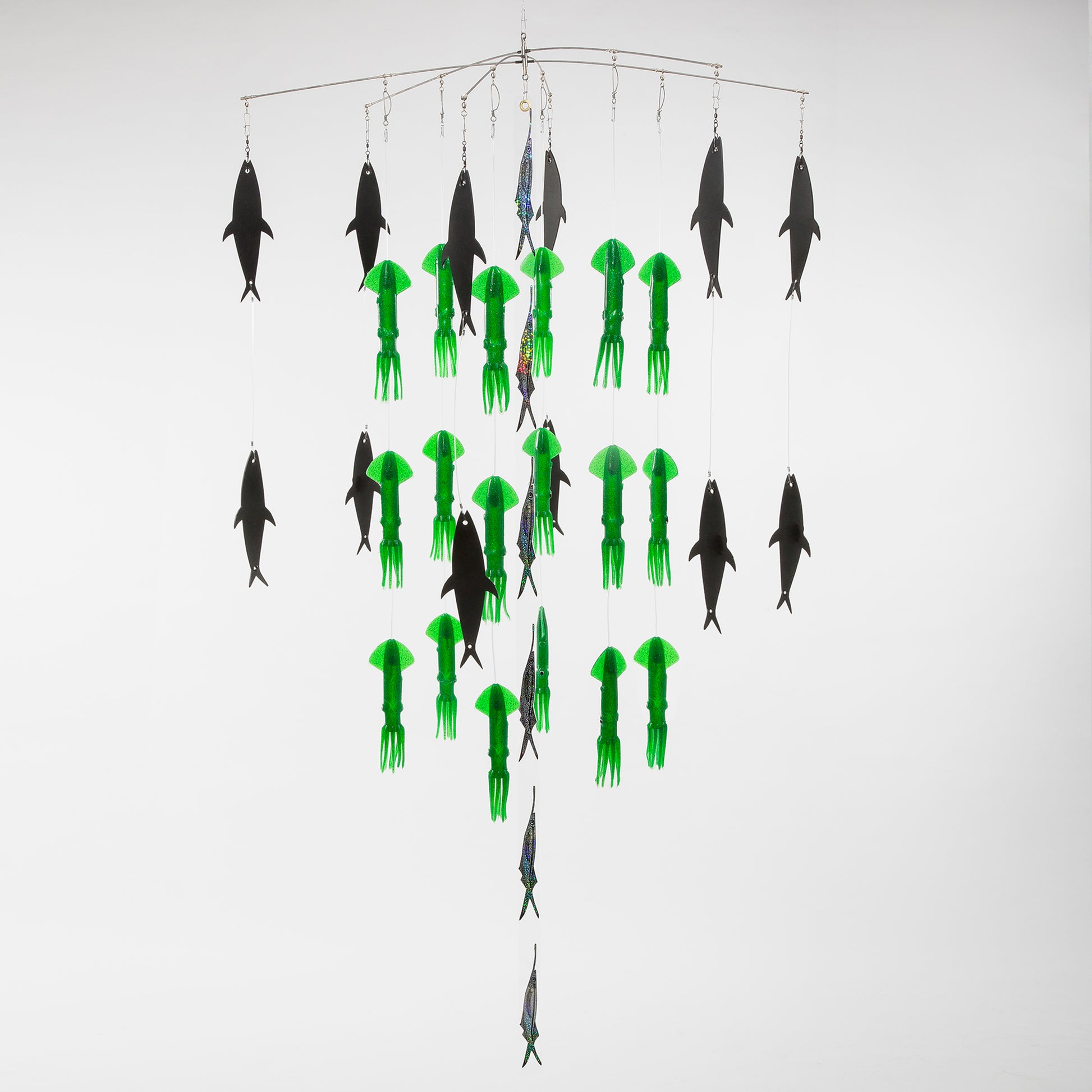 Featuring our 36” Premium Bar, there are 13 2- squid chains with a 12” Mudflap below each chain. This gives the dredge a total of 26- 9” Mold Craft Squid, and 13- 12” Mudflaps. The look this dredge gives underwater makes it impossible for a predator not to come and inspect your spread. When the tuna are chasing squid, like this dredge mimics, every other fish in the ocean that isn’t prey has to take a look. Stop missing bites by placing one of these dredges in your arsenal. Mold Craft Squids are 100% made in the USA and are tried and true. Our Mudflaps are also made in the USA and will never crack or stiffen. Mudflaps are only available in black, but choose from four colors for the Squid: Green, Red, Pink or Blue.